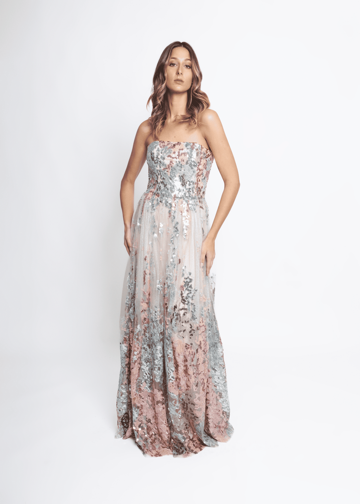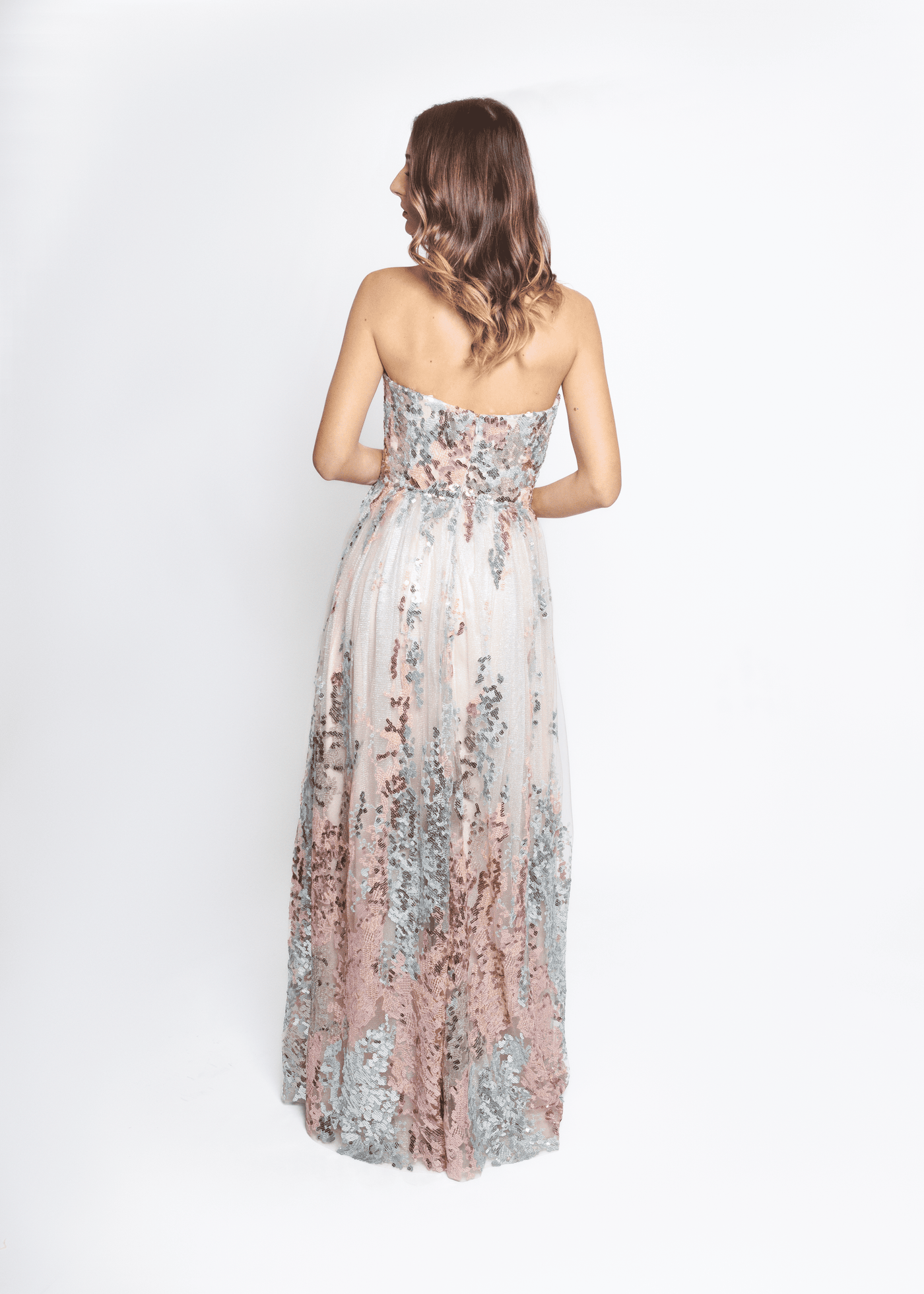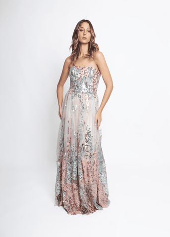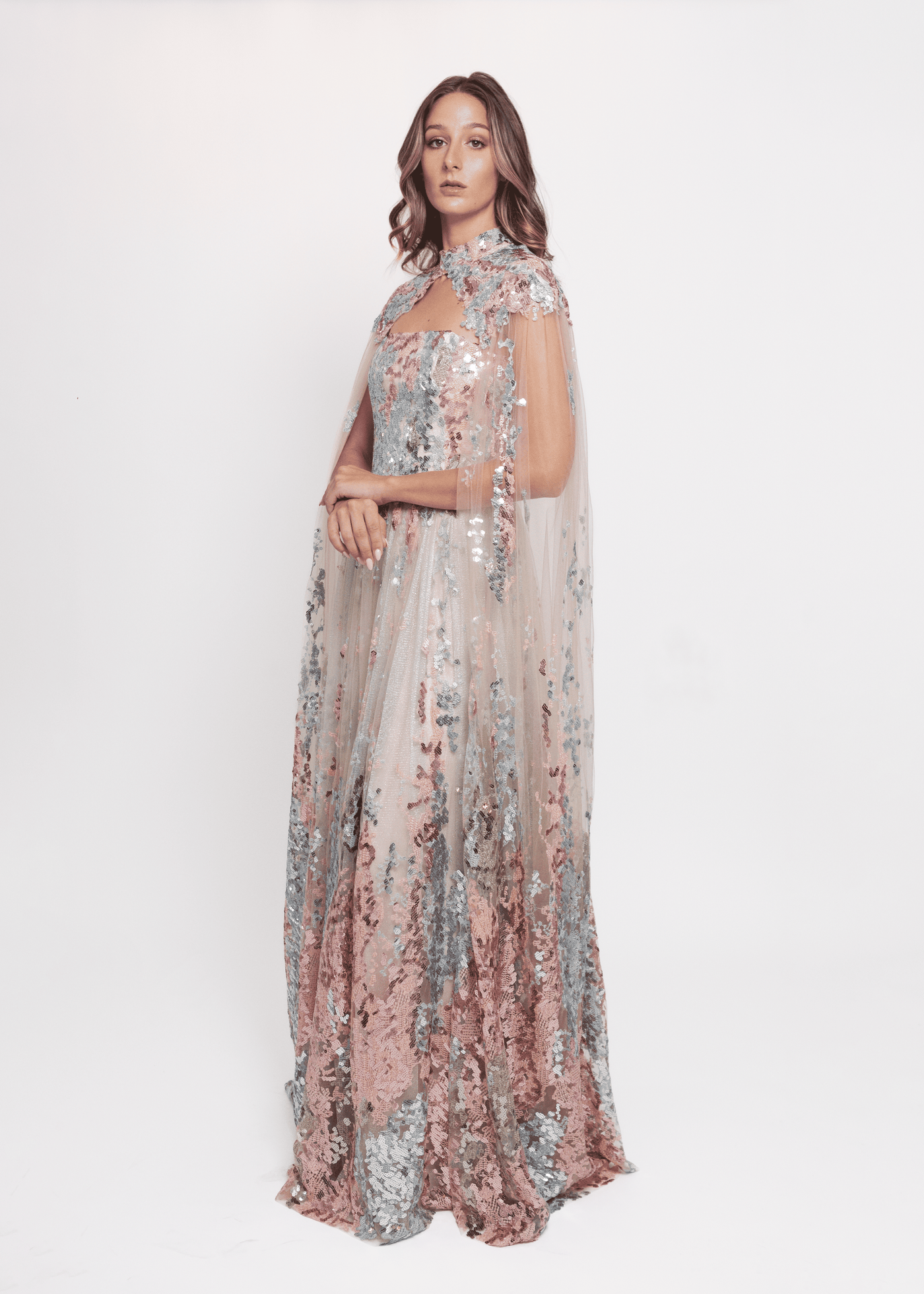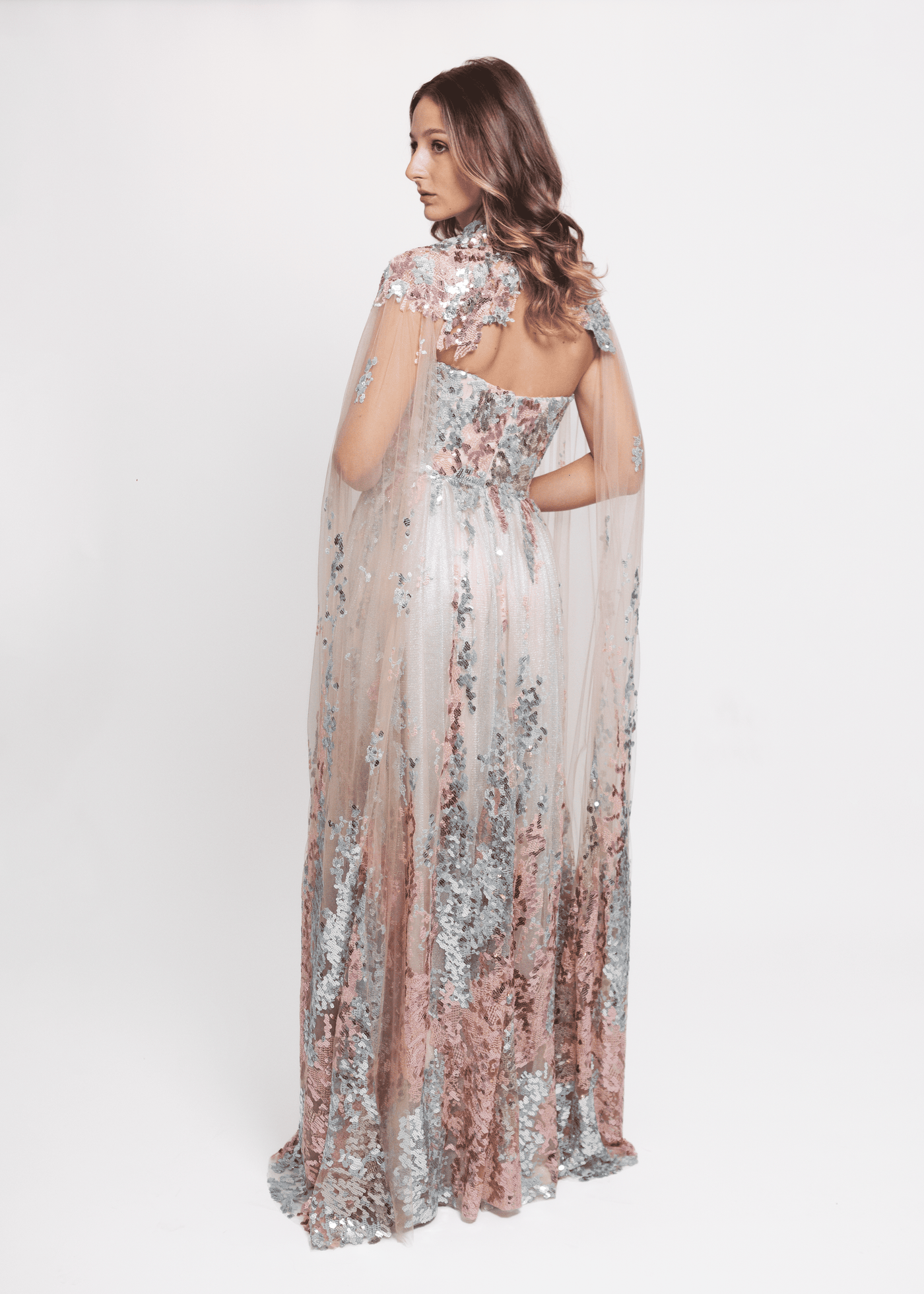 Embroidered strapless dress light blue/pink. Comes with matching cape.