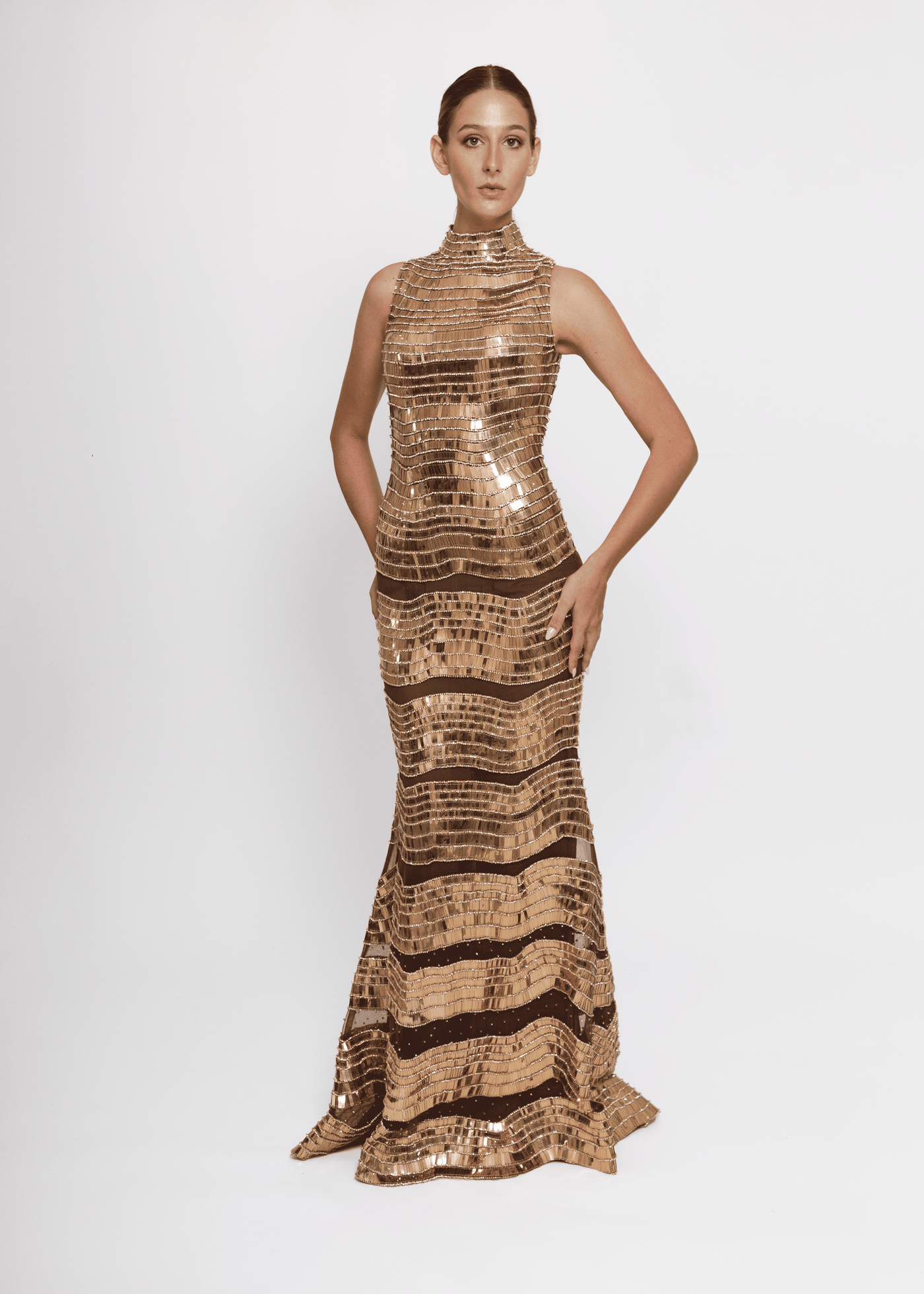 Couture high neck sleeveless crystal embroidered gown in gold/mocha