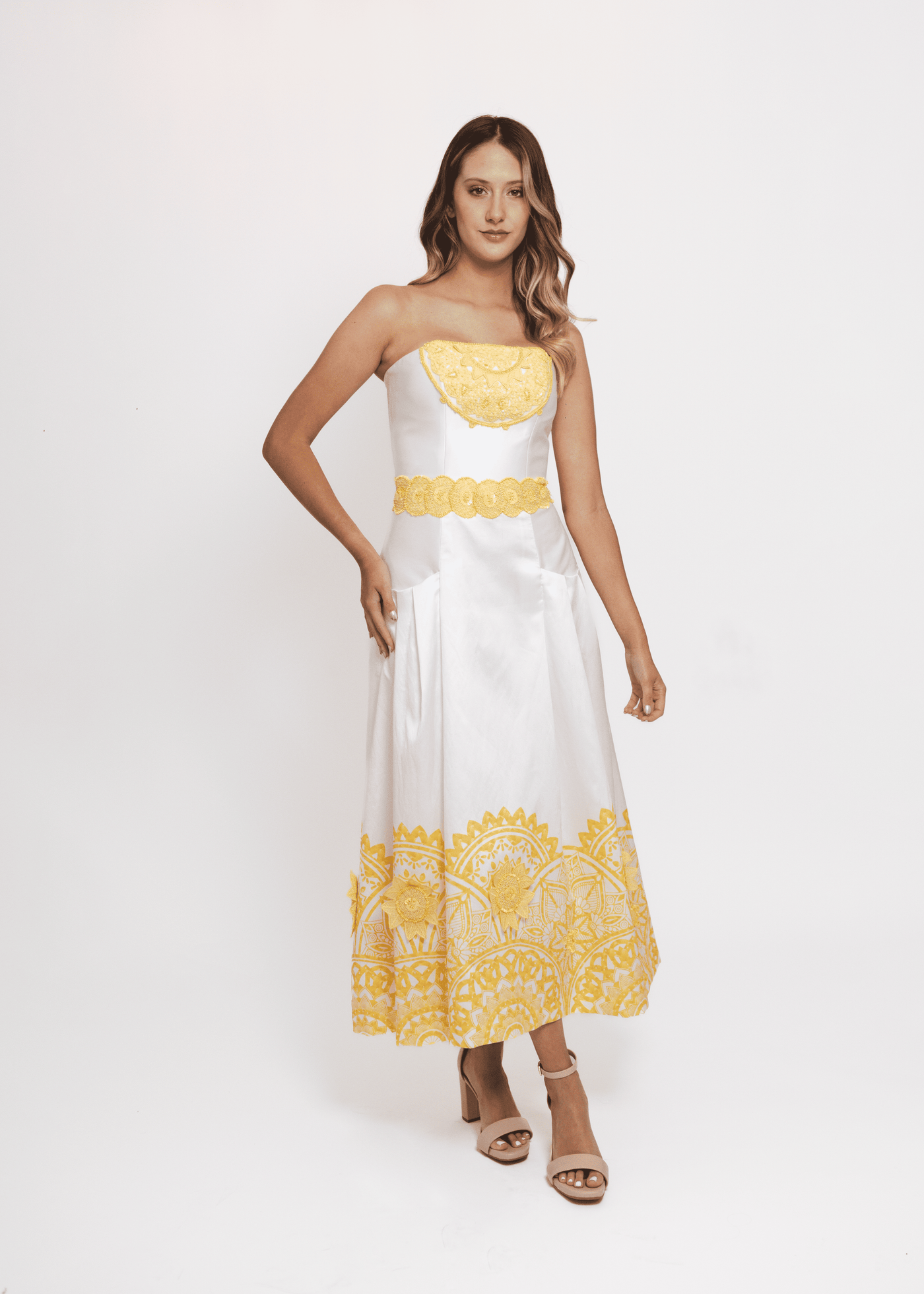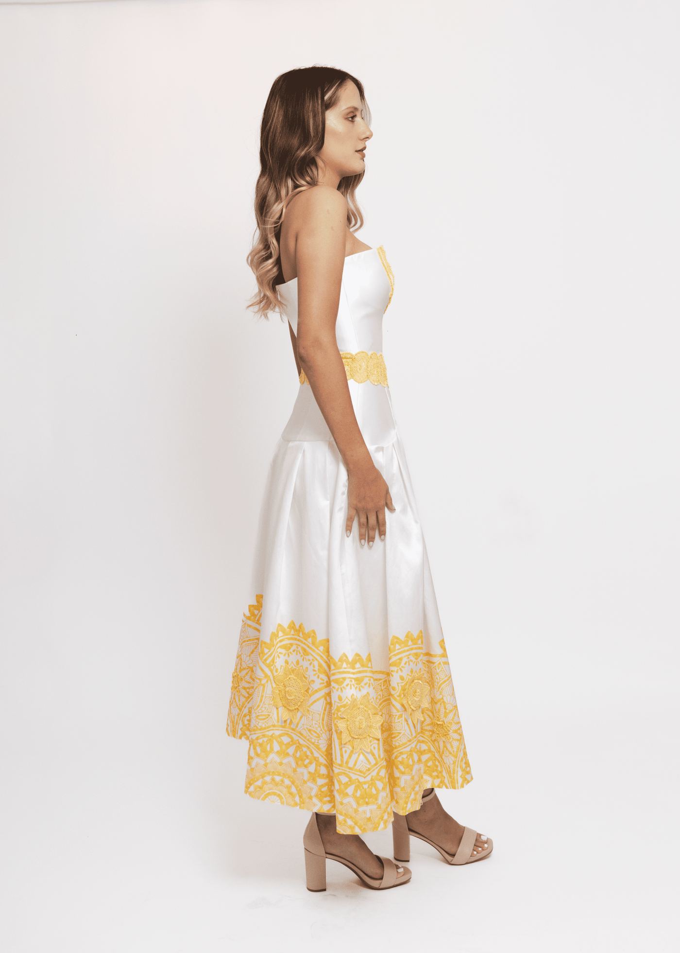 High neck, cap sleeve ankle length gown in gold and silver embroidery