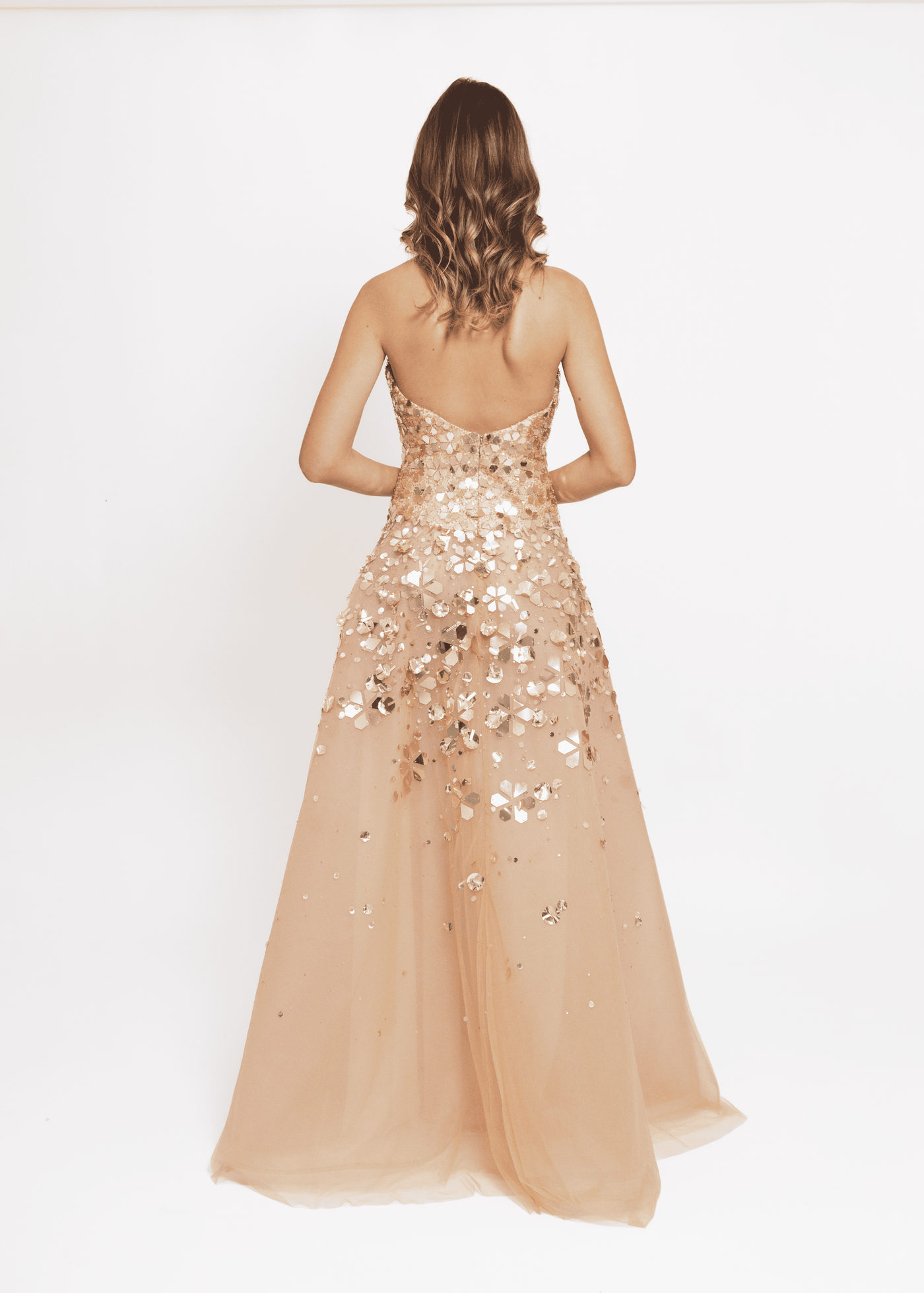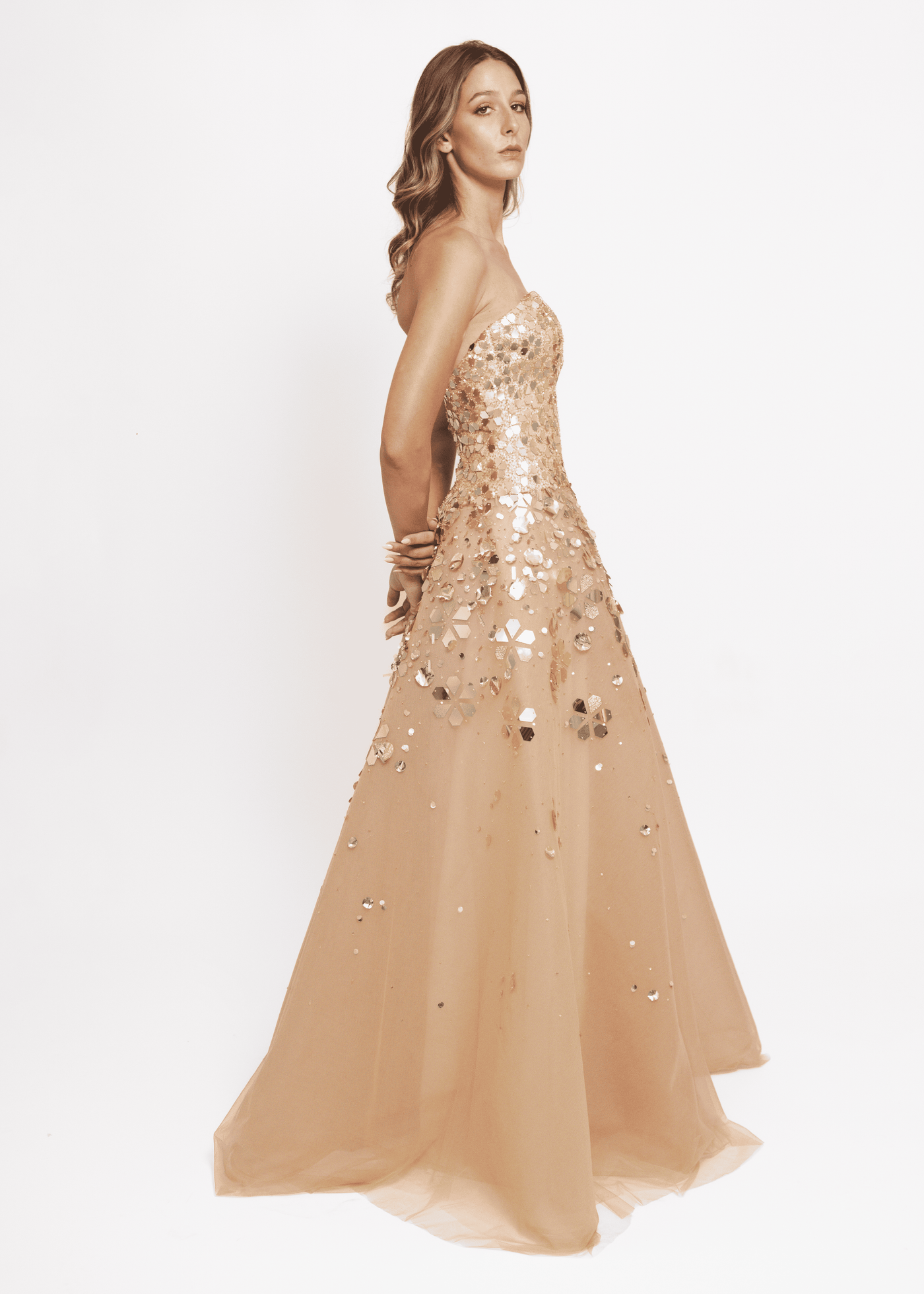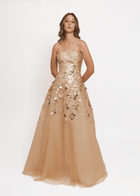 Couture strapless gown with novelty paillette embroidery gold