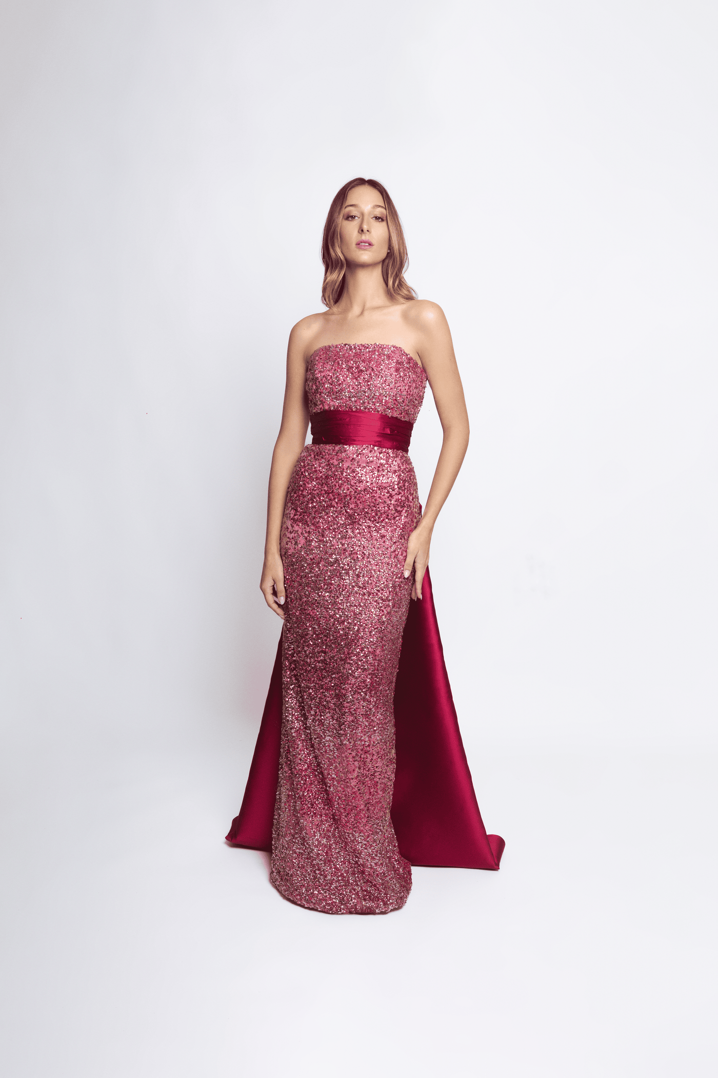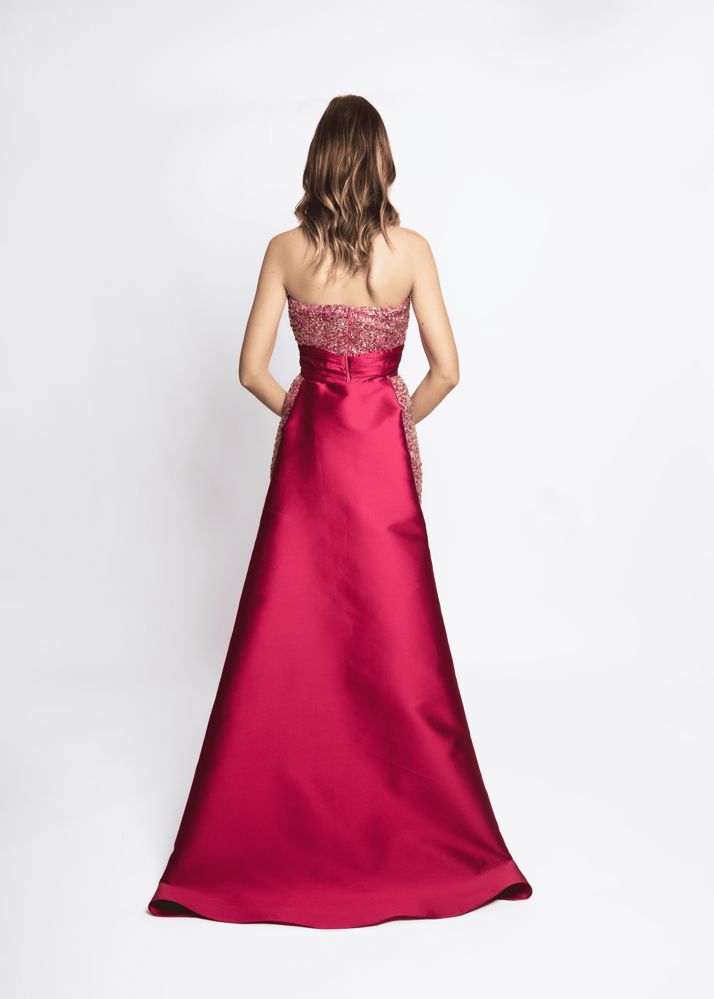 Strapless gown with paillette embroidery and silk blend mikado train
