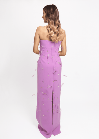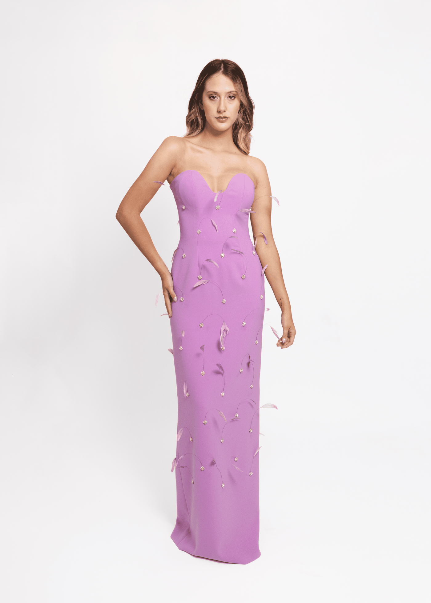 Crepe column strapless gown with crystal and cock feathers embroidery