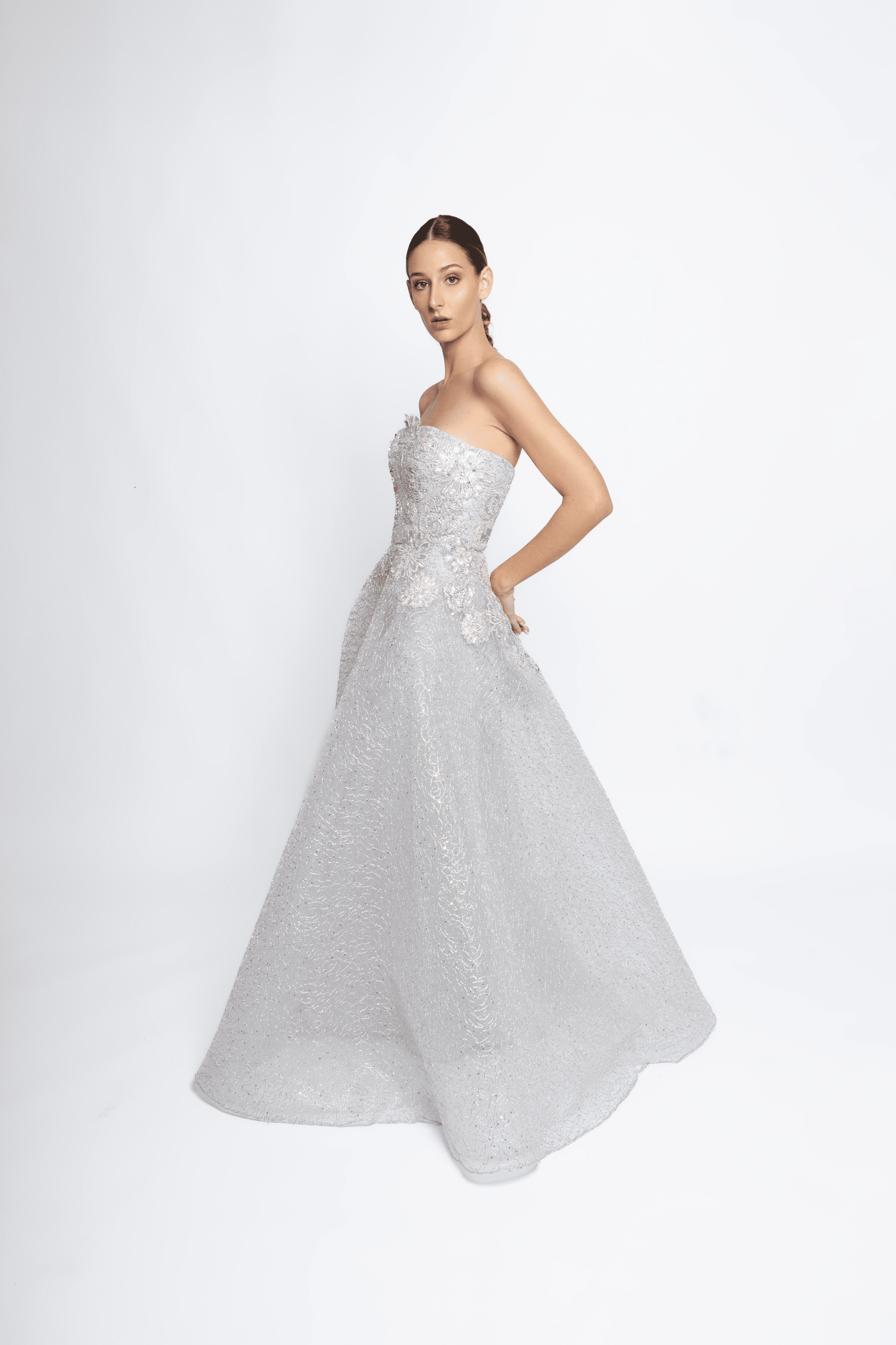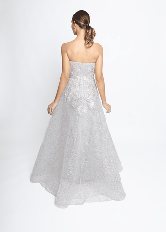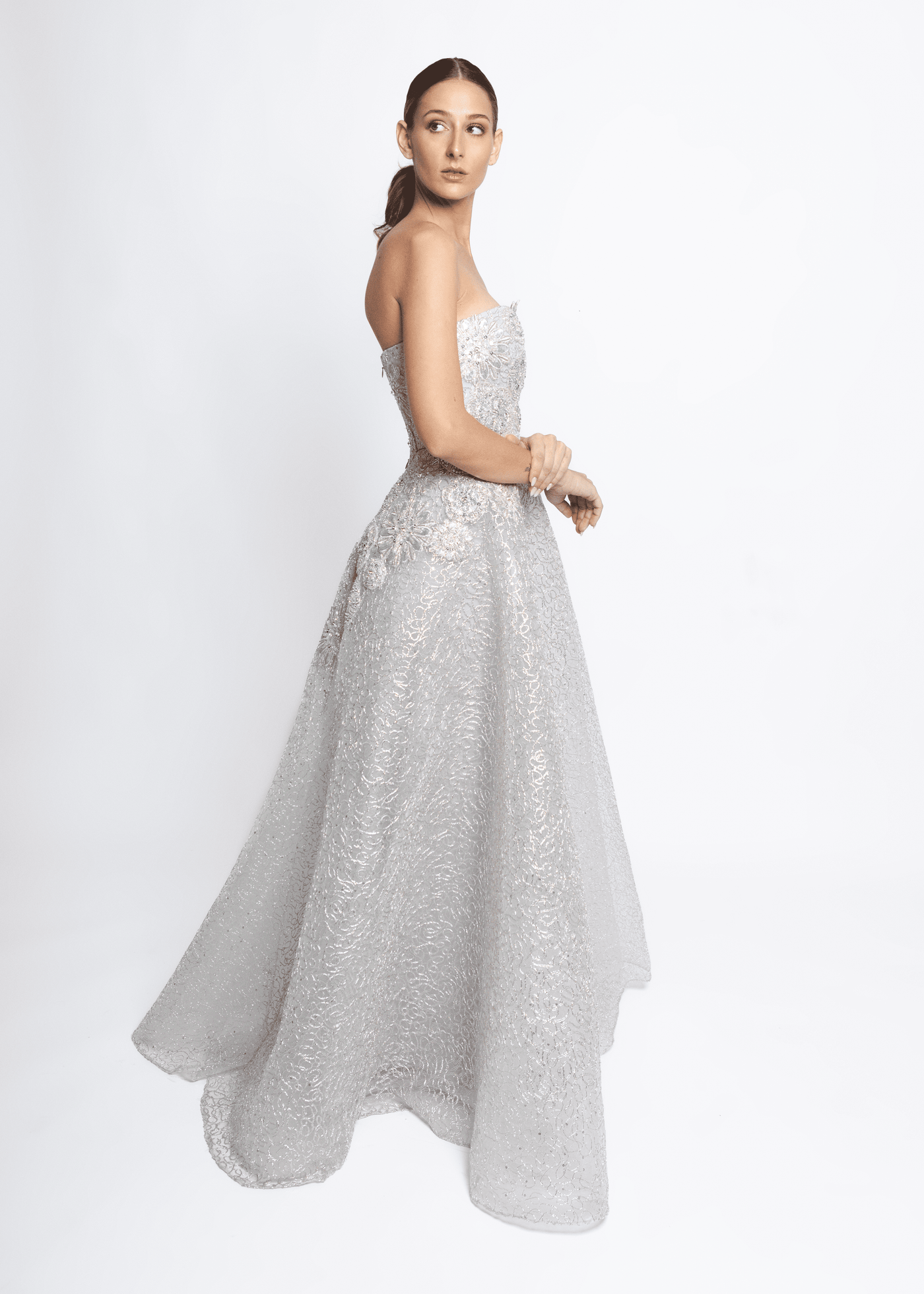 Strapless embroidered lace, silver ball gown, with crystal embroidery