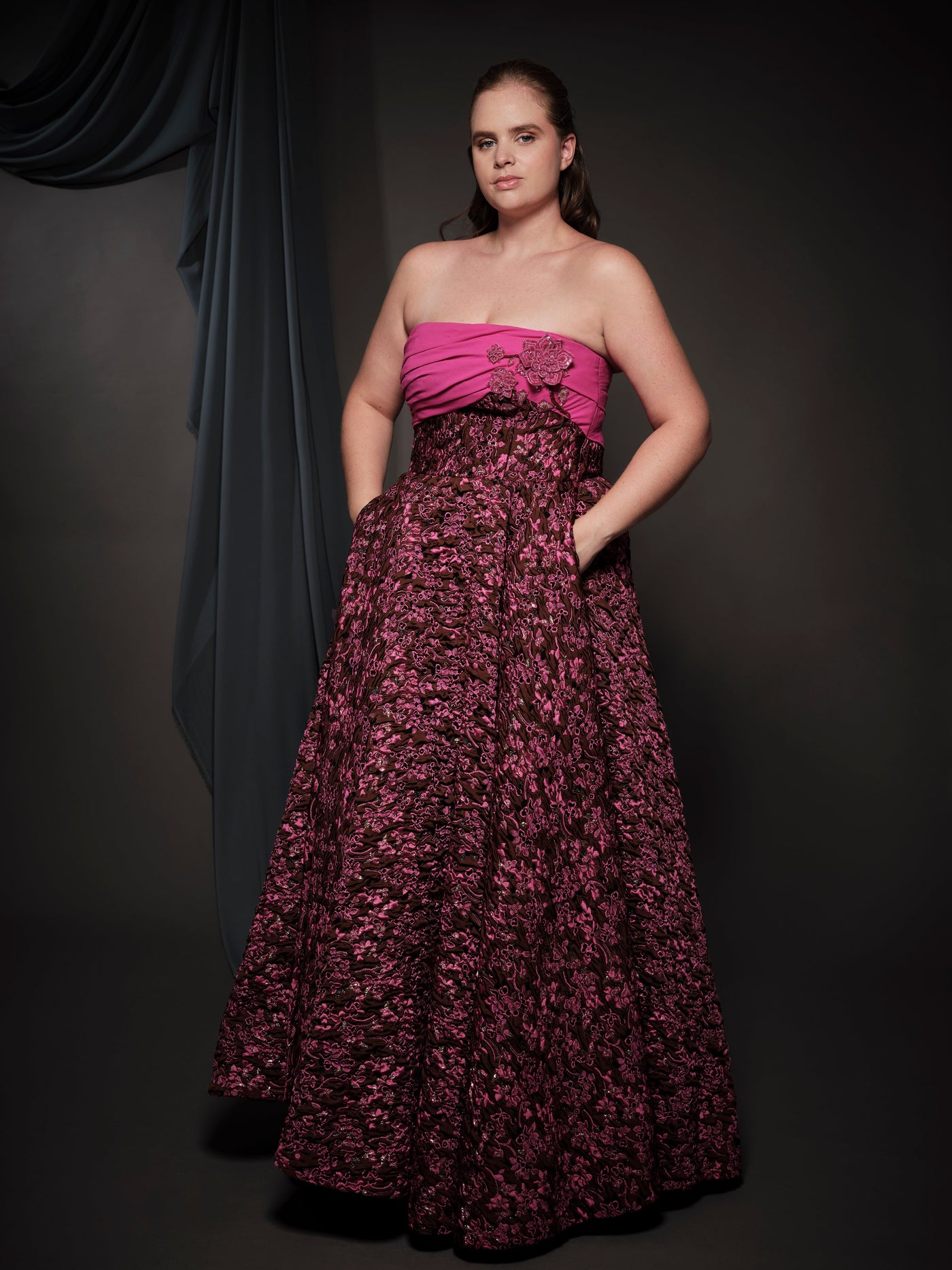chocolate jacquard dress with fuchsia